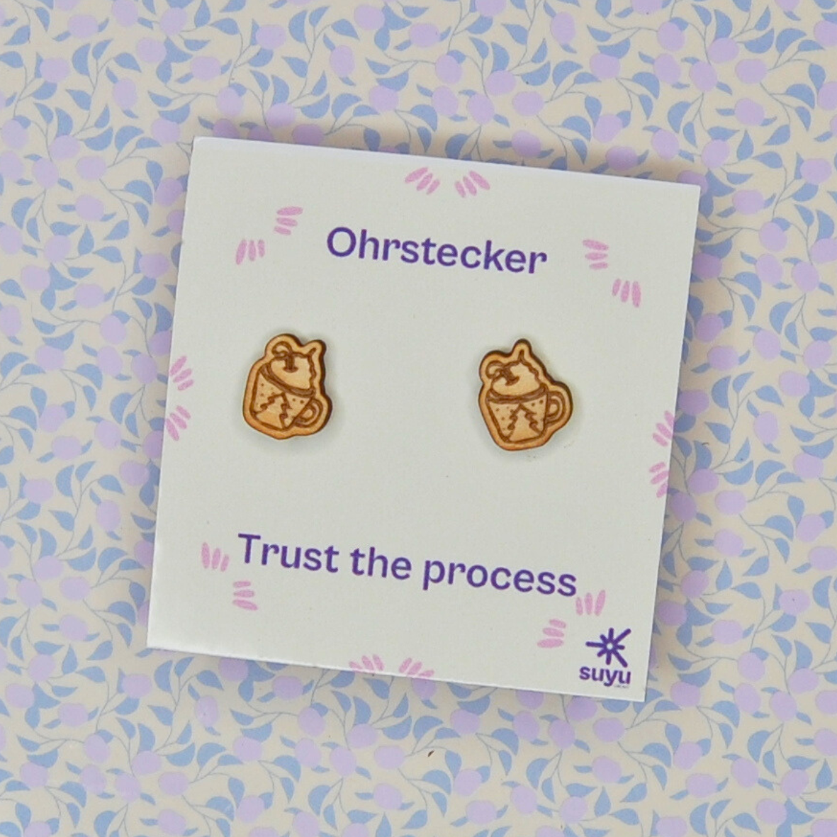 Der Ohrstecker besteht aus 2mm dickem Lindenholz und nickelfreiem Edelstahl.